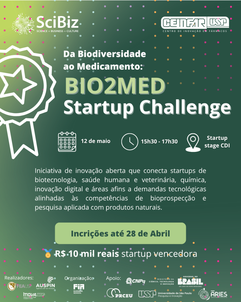 O Bio2Med Startup Challenge é uma iniciativa de inovação aberta que conecta startups de biotecnologia, saúde humana e veterinária, química, inovação digital e áreas afins a demandas tecnológicas alinhadas às competências de bioprospecção e pesquisa aplicada com produtos naturais. O processo culmina em um concurso de pitches com premiação de R$ 10 mil para a startup vencedora.