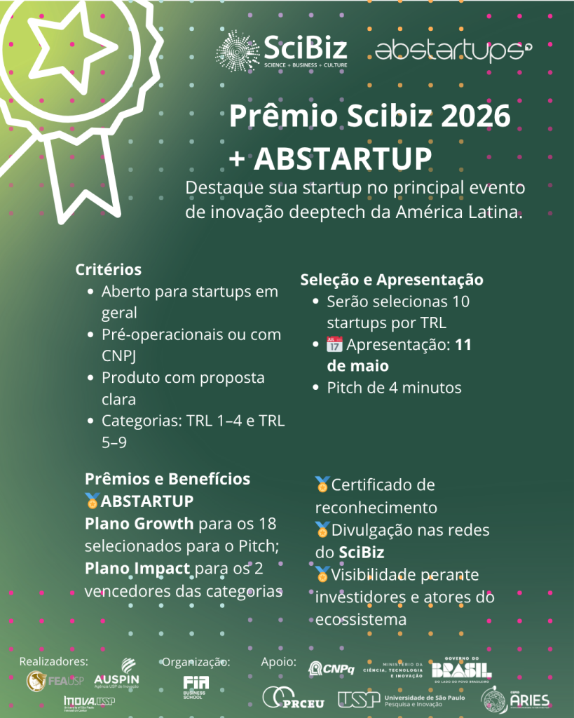 O Prêmio SciBiz + Abstartups 2026 tem como objetivo reconhecer e dar visibilidade a startups e projetos inovadores de diferentes origens, promovendo a conexão entre empreendedores, investidores, empresas e parceiros estratégicos, além de estimular o empreendedorismo e a inovação, reconhecendo soluções com elevado potencial de impacto, desenvolvimento tecnológico e escalabilidade.